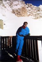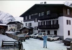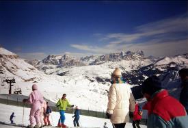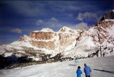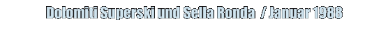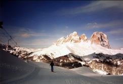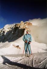 Volker und Tommy fuhren 1988 erstmals nach Südtirol in die Dolomiten. Nachdem wir den Brenner bei Schneetreiben und mit Sommerreifen glücklich passiert hatten, gönnten wir uns einen Glühwein in Costalunga auf dem Karerpass. Dann fuhren wir ins Fassatal nach Canazei in die Luxus-Pension Serena. Ohne Schneeketten hätten wir keine Chance gehabt. Mit dem Dolomiti Superski hatten wir Zugang zu allen Skigebieten um die Sella-Gruppe. Unser Hausskigebiet reichte vom Passo Pordoi bis Belvedere, aber auch zu Col Rodella und Sellajoch bei Campitello. Nach dem Genuss von Willies und Jagertees in einer der unzähligen Skihütten ging es nur noch abwärts! |