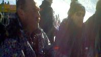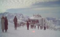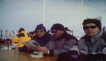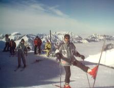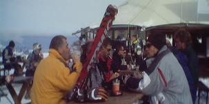 Das Skigebiet Engelberg-Titlis bot uns 82 km Pisten aller Schwierigkeitsgrade. Wir wedelten am Jochpass (2207m) und am Jochstock (2564m) und erklommen den mit 3028 Metern höchsten, aber auch kältesten Berg, den Klein Titlis oben auf dem Gletscher. Mit dem Trübsee-Hopper gondelten wir zum Trübsee. Beim Einkehren mussten die teuren Atomic-Ski natürlich mit an den Tisch! |